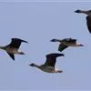 斑头雁是雁形目鸭科雁属鸟类,又称白头雁、黑纹头雁。通体大都灰褐色,头和颈侧白色,头顶有两道黑色带斑;虹膜暗棕色,嘴橙黄色,嘴甲黑色,脚和趾橙黄色;背部淡灰褐色,羽端缀有棕色,形成鳞状斑;颏、喉污白色,…全部>>