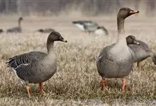 灰雁:体长70-90厘米,翼展147-182厘米,体重2.5-4千克,寿命17年。体大而肥胖。嘴、脚肉色,上体灰褐色,下体污白色,飞行时双翼拍打用力,振翅频率高。脖子较长。腿位于身体的中心支点,…全部>>