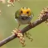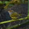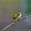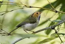 棕脸鹟莺:体长10厘米,是一种色彩亮丽而有特色的莺鸟。头栗色,具黑色侧冠纹。上体绿,腰黄色。下体白,颏及喉杂黑色点斑,上胸沾黄。与栗头鹟莺的区别在头侧栗色,白色眼圈不显著且无翼斑。…全部>>