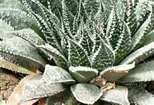 条纹十二卷 Haw.)是芦荟科十二卷属植物,为多年生肉质草本植物。植株高度10-15厘米,其呈莲座状生长;叶片紧密轮生在茎轴上,柔软多汁,呈长三角状披针形,极肥厚;叶面光滑、扁平,色深绿;叶背突起,…全部>>