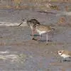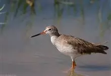 红脚鹬:体长28厘米,上体褐灰,下体白色,胸具褐色纵纹。飞行时腰部白色明显,次级飞羽具明显白色外缘。尾上具黑白色细斑。虹膜黑褐色,嘴长直而尖,基部橙红色,尖端黑褐色。脚较细长,亮橙红色,…全部>>