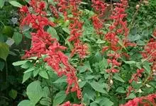 一串红,又称爆仗红、象牙红,为唇形科鼠尾草属植物。花序修长,色红鲜艳,花期又长,适应性强,为中国城市和园林中最普遍栽培的草本花卉。原产巴西、南美洲。喜温暖和阳光充足环境。不耐寒,耐半阴,忌霜雪和高温,…全部>>