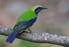 橙腹叶鹎体形大小和金额叶鹎相似,体长16~20厘米。额至后颈黄绿色,其余上体绿色,小覆羽亮钴蓝色,形成明显的肩斑。颏、喉、上胸黑色具钴蓝色髭纹,其余下体橙色。飞羽和尾羽雄鸟黑色、雌鸟绿色。…全部>>