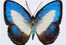 天堂凤蝶翅展可达105mm。前、后翅自基角至后缘约1/2~2/3端为纯净的宝蓝色,后角至后缘1/3~1/2端为黑色,后翅有黑色的尾突。翅背面为棕褐色。全部>>