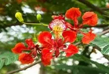 凤凰木 Raf.) ,别名火树、红花楹、凤凰花、火凤凰、金凤花、红楹,是豆科凤凰木属高大落叶乔木,树皮灰褐色,粗糙。二回偶数羽状复叶互生,矩圆形,两面均被柔毛。伞房式总状花序,花大,花瓣5枚,圆形,…全部>>