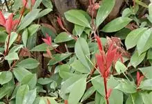 石楠 Kalkman),是蔷薇科石楠属的常绿乔木,高5~12米,株型紧凑,树冠圆球形。树枝为褐灰色;鳞片为褐色,没有毛;叶片革质,长椭圆至侧卵状椭圆形,有锯齿,新叶红色光亮。复伞房花序,白色小花,…全部>>