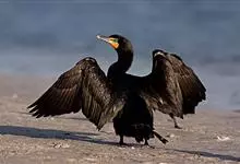 普通鸬鹚是属于鲣鸟目鸬鹚科鸬鹚属鸟类,又名水老鸦、鱼鹰、乌鬼、黑鱼郎等。体长720—900毫米,雌雄同型。通体黑色,有绿褐色金属光泽;喙厚重,喙基和喉囊橙黄色,脸颊及喉白色;夏羽颈及头饰具白色丝状羽,…全部>>