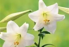 麝香百合:在中国台湾亦称铁炮百合。鳞茎球形或近球形,高2.5-5厘米;鳞片白色。茎高45-90厘米,绿色,基部为淡红色。叶散生,披针形或矩圆状披针形,两面无毛。花单生或2-3朵;花喇叭形,白色,筒外…全部>>