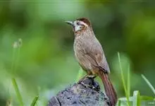 白颊噪鹛是雀形目噪鹛科噪鹛属鸟类,又称土画眉、小画眉、小噪鹃。成鸟额至头顶栗褐色,长眉纹、眼先和颊纹棕白色,眼后至耳羽深褐色,…全部>>