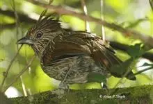 条纹噪鹛是画眉科、噪鹛属中型鸟类,体长28-32厘米。头具短的羽冠,上体栗褐色,飞羽外翻蓝灰色。下体棕栗色,腹以后转为褐白色。除飞羽和尾羽外,所有上、下体羽均具白色羽干纹。极为醒目。野外特征明显,…全部>>