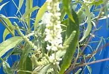 白背枫,马钱科醉鱼草属植物,常绿小灌木,高1-1.5米。嫩枝条四棱形,老枝条圆柱形;叶对生狭椭圆形或披针形,绿色无毛;总状花序窄而长,花冠芳香白色或淡绿色;蒴果椭圆状;种子灰褐色;花期1-10月,…全部>>
