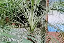 加那利海枣是棕榈科刺葵属植物,单干直立,自然高度可达18米,干径50-90厘米,幼时被以枯叶,老树则叶柄基部残存。具波状叶痕,羽状复叶,顶生丛出。雌雄异株,肉穗花序自叶间抽出,长可达2米。浆果,…全部>>
