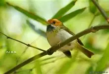 棕脸鹟莺:体长10厘米,是一种色彩亮丽而有特色的莺鸟。头栗色,具黑色侧冠纹。上体绿,腰黄色。下体白,颏及喉杂黑色点斑,上胸沾黄。与栗头鹟莺的区别在头侧栗色,白色眼圈不显著且无翼斑。…全部>>