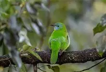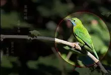 橙腹叶鹎体形大小和金额叶鹎相似,体长16~20厘米。额至后颈黄绿色,其余上体绿色,小覆羽亮钴蓝色,形成明显的肩斑。颏、喉、上胸黑色具钴蓝色髭纹,其余下体橙色。飞羽和尾羽雄鸟黑色、雌鸟绿色。…全部>>