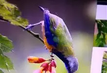 橙腹叶鹎体形大小和金额叶鹎相似,体长16~20厘米。额至后颈黄绿色,其余上体绿色,小覆羽亮钴蓝色,形成明显的肩斑。颏、喉、上胸黑色具钴蓝色髭纹,其余下体橙色。飞羽和尾羽雄鸟黑色、雌鸟绿色。…全部>>