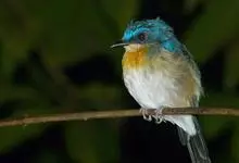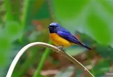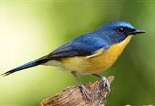 山蓝仙鹟:小型鸟类,体长13-15厘米。雄鸟额基和眼先黑色,颏橙棕色,仅颏尖为蓝黑色,喉、胸、上腹和两胁亦为橙棕色,下体白色范围较小,仅局限于下腹和尾下覆羽。雌鸟上体少黄色,颏、喉、胸概为锈红色,…全部>>