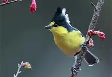 台湾黄山雀体长约13厘米。头顶至后颈黑色,有一长的黑色羽冠,羽冠末端和后颈中央白色。背苍绿色,两翅和尾黑色,羽缘蓝灰色,外侧尾羽白色。额基和下体鲜黄色,尾下覆羽白色,雄鸟腹部有一黑斑。…全部>>