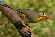 银耳相思鸟小型鸟类,体长14~18厘米。头顶黑色,耳羽银灰色,前额橙黄色;外侧飞羽橙黄色,基部朱红色,极为鲜艳、醒目。尾圆形,尾上、尾下覆羽朱红色,尾暗灰褐色,外侧尾羽橙黄色,其余上体橄榄绿或橄榄黄色。…全部>>