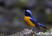 山蓝仙鹟:小型鸟类,体长13-15厘米。雄鸟额基和眼先黑色,颏橙棕色,仅颏尖为蓝黑色,喉、胸、上腹和两胁亦为橙棕色,下体白色范围较小,仅局限于下腹和尾下覆羽。雌鸟上体少黄色,颏、喉、胸概为锈红色,…全部>>