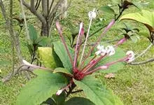烟火树 Merr.)是唇形科、大青属常绿灌木或小乔木,株高可达4米。幼枝方形,墨绿色。叶对生,长椭圆形或披针形,先端尖,全缘或波状缘。纸质,叶背暗紫红色。聚伞状圆锥花序,顶生,小花多数,聚生成团,…全部>>