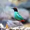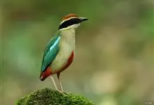 绿胸八色鸫:是雀形目八色鸫科的鸟类,共有12个亚种。体长为16-18厘米,体重65-69克。体型圆胖,尾短,腿长。头黑,上体绿色,两翼深色而具白色斑纹,头顶至后枕深褐,胸及腹部苹果绿,臀亮红。…全部>>