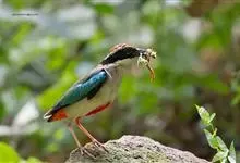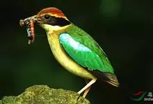 绿胸八色鸫:是雀形目八色鸫科的鸟类,共有12个亚种。体长为16-18厘米,体重65-69克。体型圆胖,尾短,腿长。头黑,上体绿色,两翼深色而具白色斑纹,头顶至后枕深褐,胸及腹部苹果绿,臀亮红。…全部>>