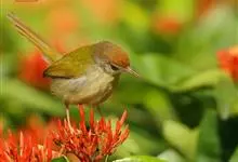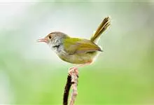 普通缝叶莺,是雀形目鹅科莺亚科缝叶莺属一种。体长10-14厘米,体重7-10克,雄鸟前额棕红,头顶至枕棕橄榄褐,上体橄榄绿染黄,飞羽及尾羽暗褐;繁殖期雄鸟的中央尾羽特形延长,下体淡皮黄白色。…全部>>