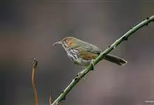 长嘴钩嘴鹛是画眉科、钩嘴鹛属中型鸟类,体长24-27厘米。嘴粗壮、长而尖且向下弯曲。上体橄榄褐色或橄榄棕褐色,颊和耳羽灰褐色,其后有一栗红色斑,耳羽上面从眼后开始有一长的白色纵纹沿颈侧向下。下体白色,…全部>>
