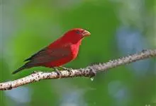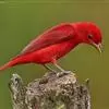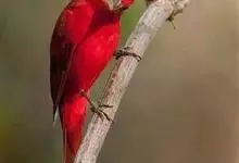 血雀雀科朱雀属鸟类,体重36-49克;体长155-182毫米。雄鸟除眼先、翼与尾为黑色外,通体为鲜红色;嘴鲜黄;雌鸟暗橄榄绿色,羽端较淡或带黄色;腰鲜黄;嘴较暗。虹膜褐色;嘴黄色;腿和脚褐色。…全部>>