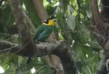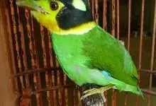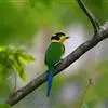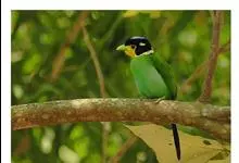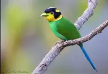 长尾阔嘴鸟是雀形目阔嘴鸟科的鸟类,体长约25厘米,是绿色阔嘴鸟。形长的楔形尾蓝色,喉及脸黄色,顶冠及颈背黑色。两翼黑并具显著的蓝色斑块。头顶具蓝色小点斑,眼后有一黄色点斑。亚成鸟多为绿色。结群活动于…全部>>