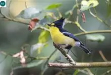 台湾黄山雀体长约13厘米。头顶至后颈黑色,有一长的黑色羽冠,羽冠末端和后颈中央白色。背苍绿色,两翅和尾黑色,羽缘蓝灰色,外侧尾羽白色。额基和下体鲜黄色,尾下覆羽白色,雄鸟腹部有一黑斑。…全部>>