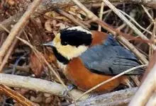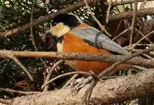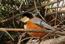 杂色山雀,是山雀科山雀属的一种动物。体重17-18克,体长125-140毫米。雌雄羽色相似。额、眼先、耳羽至颈侧乳黄色,头顶至后颈黑色,后头中央有一白斑。上背栗色,上体余部及翼蓝灰色。颏、喉黑色,…全部>>