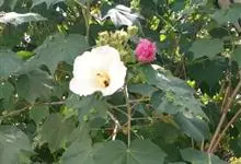 木芙蓉,锦葵科木槿属落叶灌木或小乔木。小枝上有细绒毛;叶片为卵状心形,托叶为披针形,常早落;花单生,花萼为钟形,花冠初为白色或淡红色,后逐渐变为深红色;果实为扁球形,有淡黄色的毛附着。花期8到10月。…全部>>
