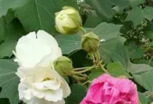 木芙蓉,锦葵科木槿属落叶灌木或小乔木。小枝上有细绒毛;叶片为卵状心形,托叶为披针形,常早落;花单生,花萼为钟形,花冠初为白色或淡红色,后逐渐变为深红色;果实为扁球形,有淡黄色的毛附着。花期8到10月。…全部>>