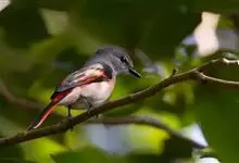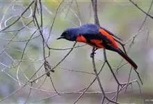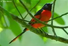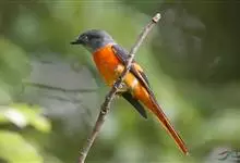 灰喉山椒鸟:共有8个亚种。体长18-22厘米。雄鸟头部和背亮黑色,腰、尾上覆羽和下体朱红色,翅黑色具一大一小的两道朱红色翼斑。中央尾羽黑色,外侧尾羽基部黑色,端部红色。…全部>>