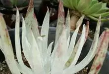 仙女杯 布瑞东尼 Dudleya brittonii,在墨西哥北部近海沿岸,蒂华纳以南,拉米西恩附近均有分布。植物学家布瑞登发现该品种为此命名,故名布瑞东尼,也有以其叶片宽大特征,直接叫做宽叶仙女杯…全部>>