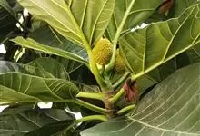 面包树 Fosberg)是桑科波罗蜜属植物。叶大,成熟之叶羽状分裂,表面深绿色,背面浅绿色;穗状花序单生叶腋,雄花序长圆筒形至长椭圆形或棒状;聚花果倒卵圆形或近球形;花期为3~5月,果期为7~10月。…全部>>
