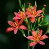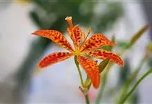 射干 Redouté)是鸢尾科射干属多年生草本植物。根状茎为不规则的块状,斜黄色或黄褐色;花橙红色,散生紫褐色的斑点;花药呈条形;子房下位,倒卵形;蒴果倒卵形或长椭圆形;种子圆球形,黑紫色,有光泽。…全部>>