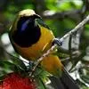 金额叶鹎是和平鸟科、叶鹎属的鸟类。体长16-20厘米。额和头顶前部金桔色,整个上体包括两翅表面草绿色。颏、喉黑色,其外围有一圈黄色,其余下体浅绿色,翼缘蓝紫色,翅上小覆羽翠蓝色。野外特征极明显,…全部>>