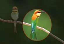 栗喉蜂虎是蜂虎科蜂虎属的鸟类。有热带鸟类羽毛艳丽的特征:喉部是栗红色的,黑色的过眼纹,翅膀和背部是绿色的,尾翼是蓝色的,飞行时翅膀下面的羽毛是橙黄色的,在阳光的照射下,它们全身闪烁着金属般的艳丽光泽,…全部>>