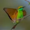 绿喉蜂虎是佛法僧目、蜂虎科的小型鸟类,共有9个亚种。身长22-25厘米,翼展29-30厘米,体重15-20克。喉绿色,额部、头顶至上背为锈红色,其余上体均为亮绿色。中央尾羽延长且端段狭细,…全部>>
