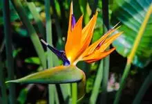 鹤望兰,别名天堂鸟,为鹤望兰科鹤望兰属的一种多年生草本植物;无木质树干;花序生于与叶柄近等长或稍短的花序梗上,佛焰苞1;花较小,萼片橙黄色,长7.5-10厘米,箭头状花瓣基部具耳状裂片,…全部>>