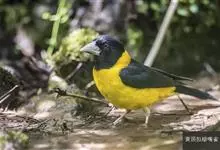 黄颈拟蜡嘴雀:小型鸟类,体长20-22厘米。嘴粗大,黑色。雄鸟整个头、颈、颏、喉和上胸辉黑色,两翅和尾亦为黑色,其余上体橙黄色,下体鲜黄色。雌鸟头、颈、颏、喉和上胸中央灰色或暗灰色,…全部>>