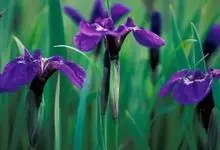 花菖蒲:是玉蝉花的变种。多年生宿根挺水型水生花卉。根状茎短而粗,须根多并有纤维状枯叶梢,叶基生,线形,叶中脉凸起,两侧脉较平整。花葶直立并伴有退化叶1-3枚。花大直径可达15厘米。外轮三片花瓣呈椭圆…全部>>