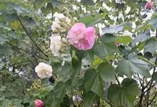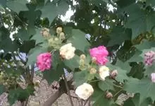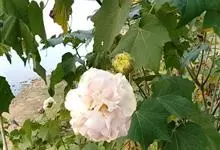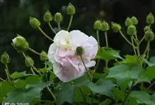 木芙蓉,锦葵科木槿属落叶灌木或小乔木。小枝上有细绒毛;叶片为卵状心形,托叶为披针形,常早落;花单生,花萼为钟形,花冠初为白色或淡红色,后逐渐变为深红色;果实为扁球形,有淡黄色的毛附着。花期8到10月。…全部>>