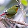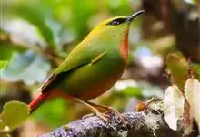 火尾绿鹛是莺科、绿鹛属小型鸟类,体长11-14厘米。上体绿色,头顶至枕具黑色鳞状斑,眼先和眼后黑色,眉纹黄绿色。两翅黑色具黄色和红色翅斑及白色端斑,极为醒目。中央一对尾羽绿色,外侧尾羽鲜红色。…全部>>