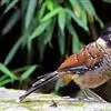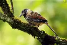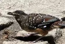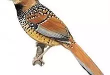 大噪鹛:中型鸟类,体长32-36厘米。额至头顶黑褐色,背栗褐色满杂以白色斑点,斑点前缘或四周还围有黑色。初级覆羽、大覆羽和初级飞羽具白色端斑。尾特长,均具黑色亚端斑和白色端斑。颏、喉棕褐色,…全部>>