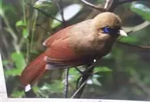 棕噪鹛中型鸟类,体长25~28厘米。上体赭褐色,头顶具黑色羽缘,尾上覆羽灰白色,尾羽棕栗色,外侧尾羽具宽阔的白色端斑。额、眼先、眼周、耳羽上部、脸前部和颏黑色,眼周裸皮蓝色,极为醒目。喉和上胸与背同色,…全部>>