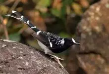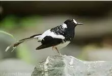 斑背燕尾是鹟科、燕尾属中型鸟类,体长24-25厘米。额至头顶前部白色,其余头、颏、喉、胸黑色,后颈有一白领,背黑色具圆形白色斑点,腰白色,两翅黑色具白色翅斑,尾呈深叉状,黑色、具白色端斑。…全部>>