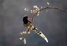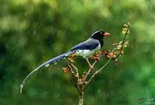 红嘴蓝鹊,别名山鹊、长尾鹊,是鸦科蓝鹊属的一种观赏性较强的大型鸣禽。该物种为体长54~65cm,头、颈、喉和胸黑色,头顶至后颈有一块白色至淡蓝白色或紫灰色块斑,其余上体紫蓝灰色或淡蓝灰褐色。尾长呈凸状,…全部>>